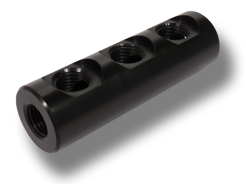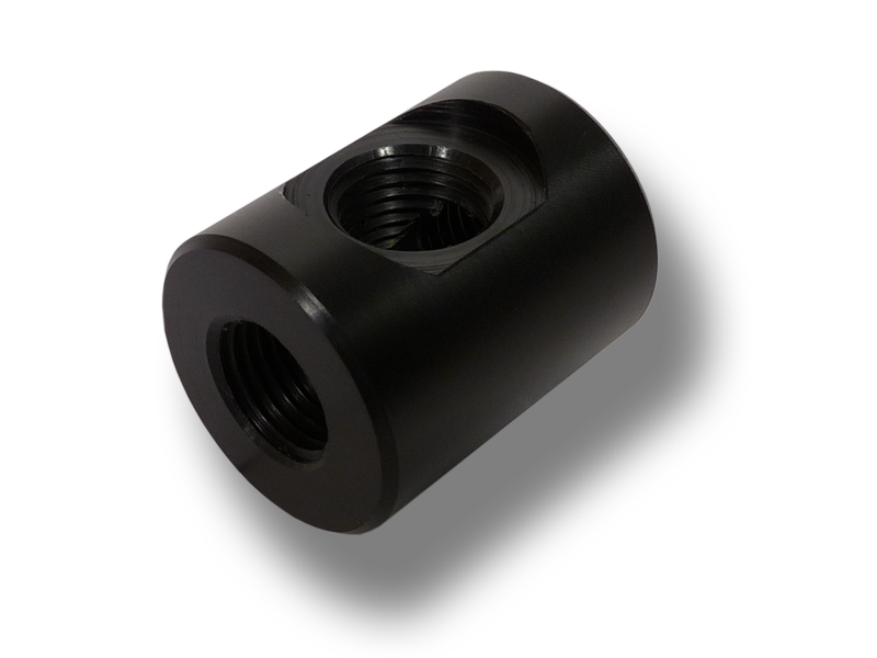 Spojka s délkou 82 mm a 3x výstupním závitem G1/4" pro našroubování teplotního čidla nebo zátky (například vypouštění okruhu). Celkem 5x závit G1/4”. Vyrobeno z kvalitního černého plastu Ertacetal.
